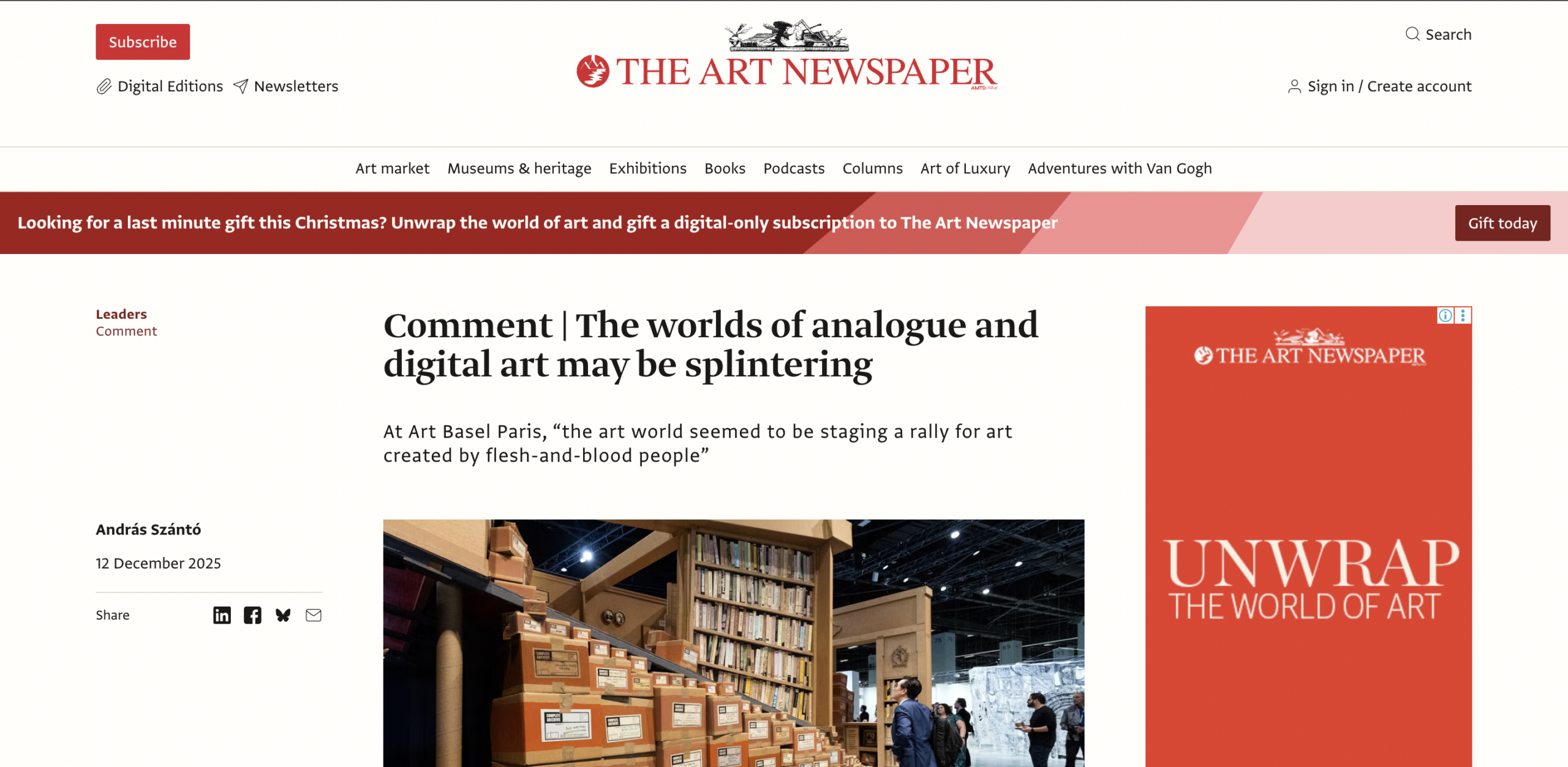 “The worlds of analogue and digital art may be splintering” by András Szántó for The Art Newspaper