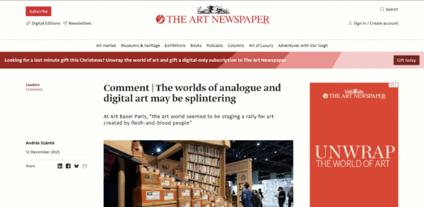 Article “The worlds of analogue and digital art may be splintering” by András Szántó for The Art Newspaper
